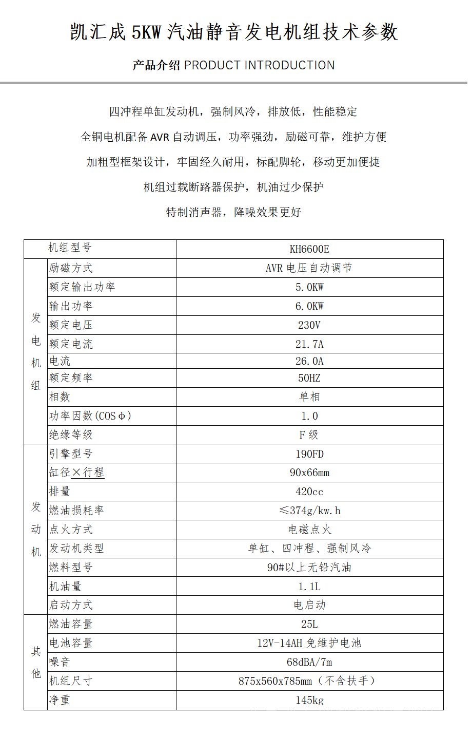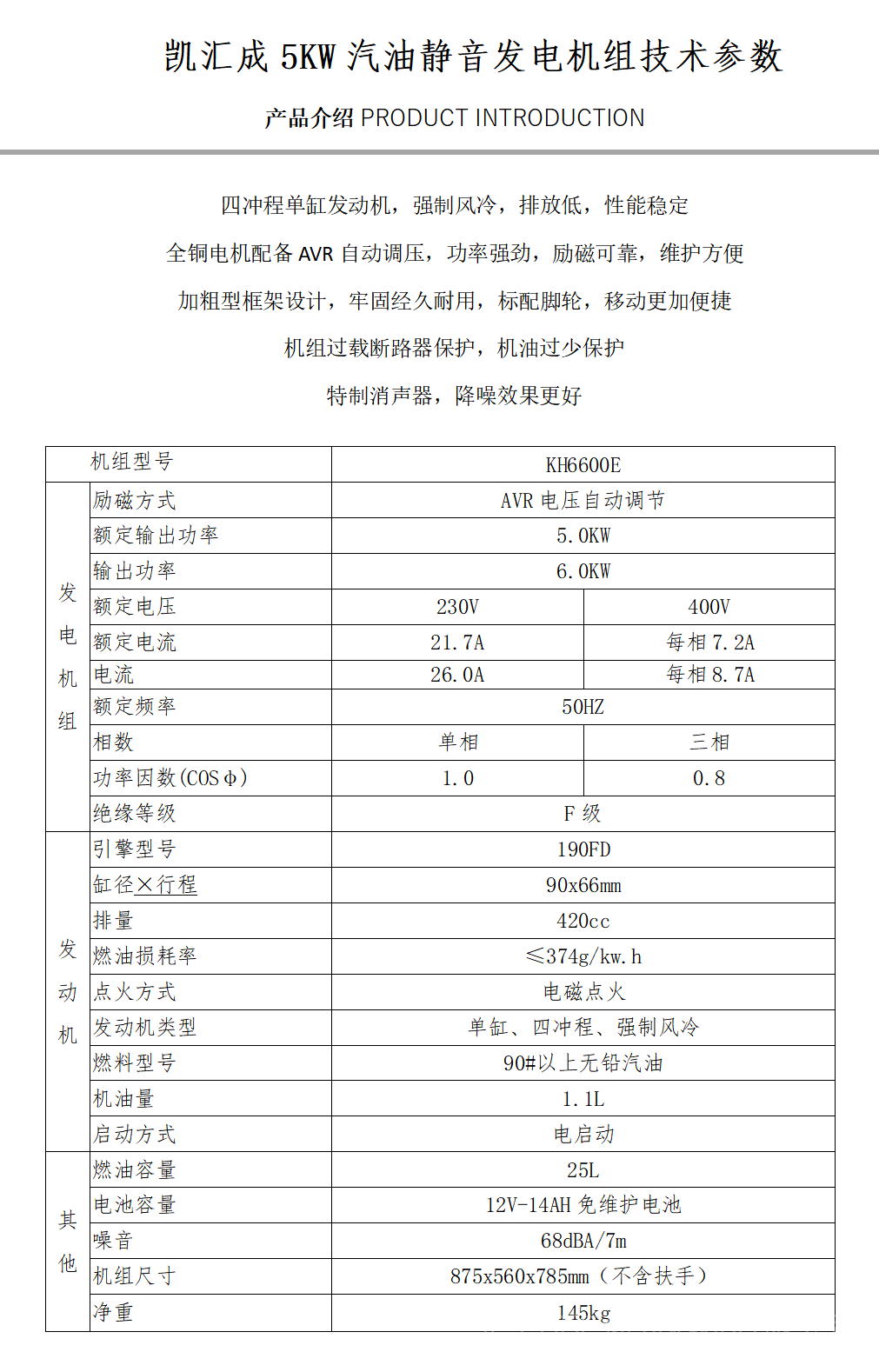 凯汇成品牌 静音便携式汽油发电机 5kw 静音系列 单三相 220VKH6600E