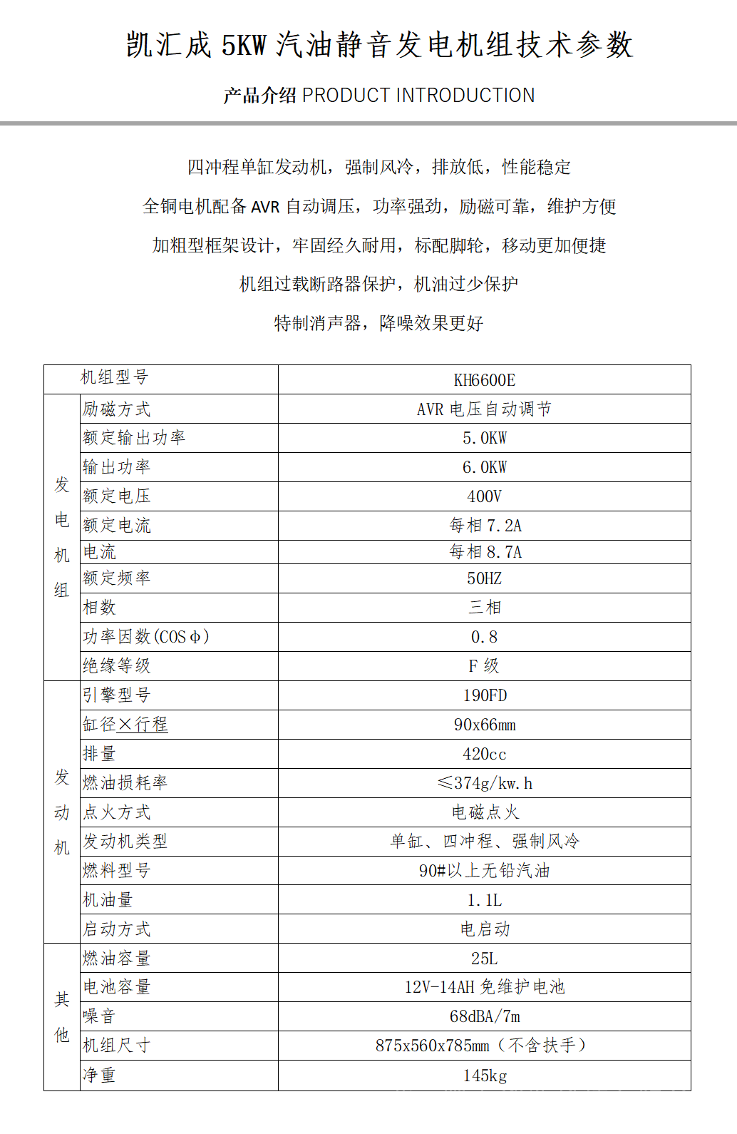 详细信息| 询价留言品牌:凯汇成 加工定制:是 型号:KH6600E 相数:单三相 发动机型号:190FD 额定功率:5.0 KW 额定电压:230 V 起动方式:电磁点火 额定功率:5.0 KW -