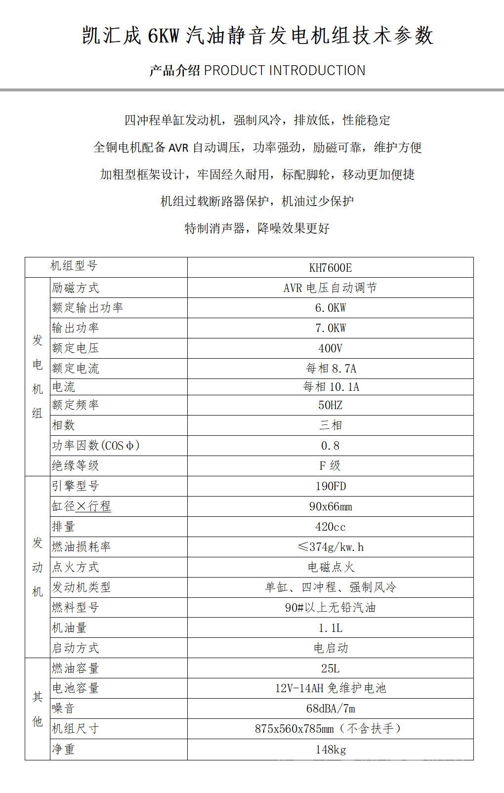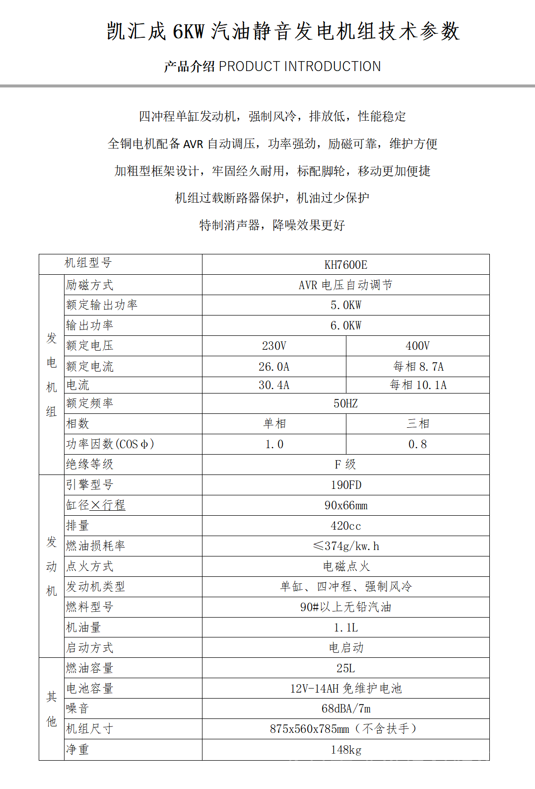凯汇成品牌 静音便携式汽油发电机 6kw 静音系列 单三相KH7600E