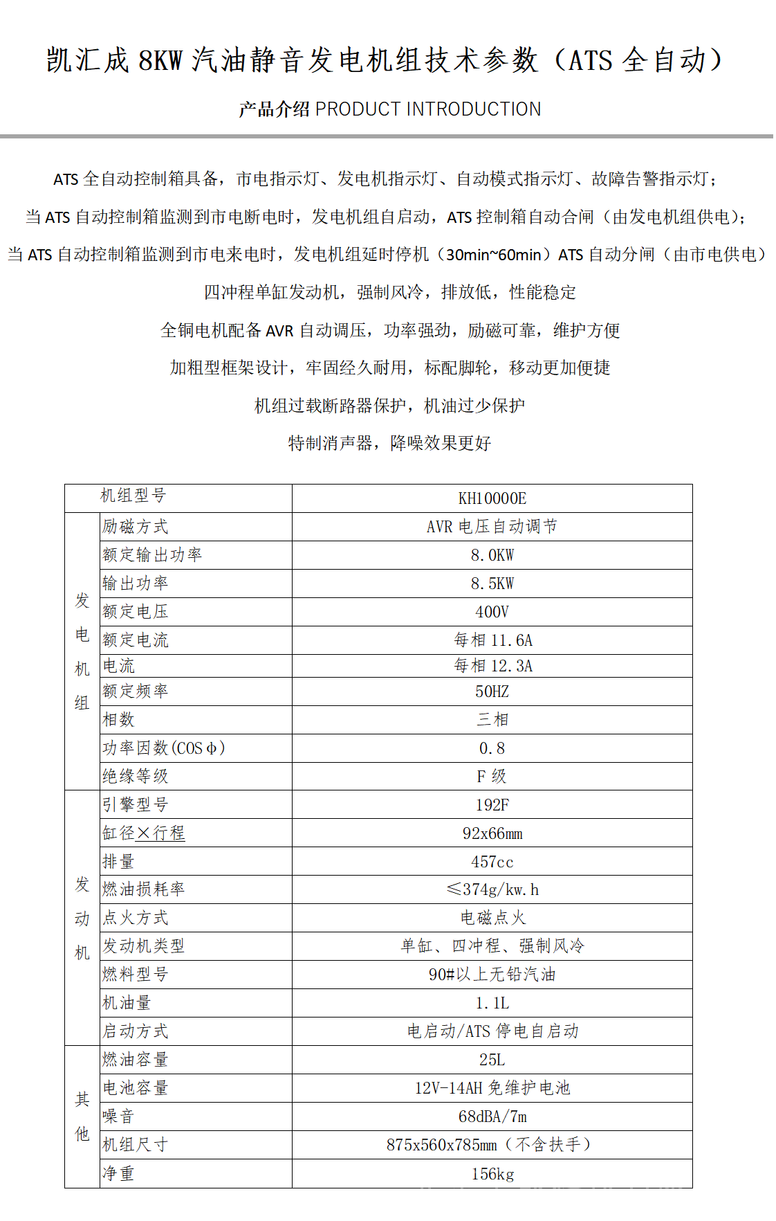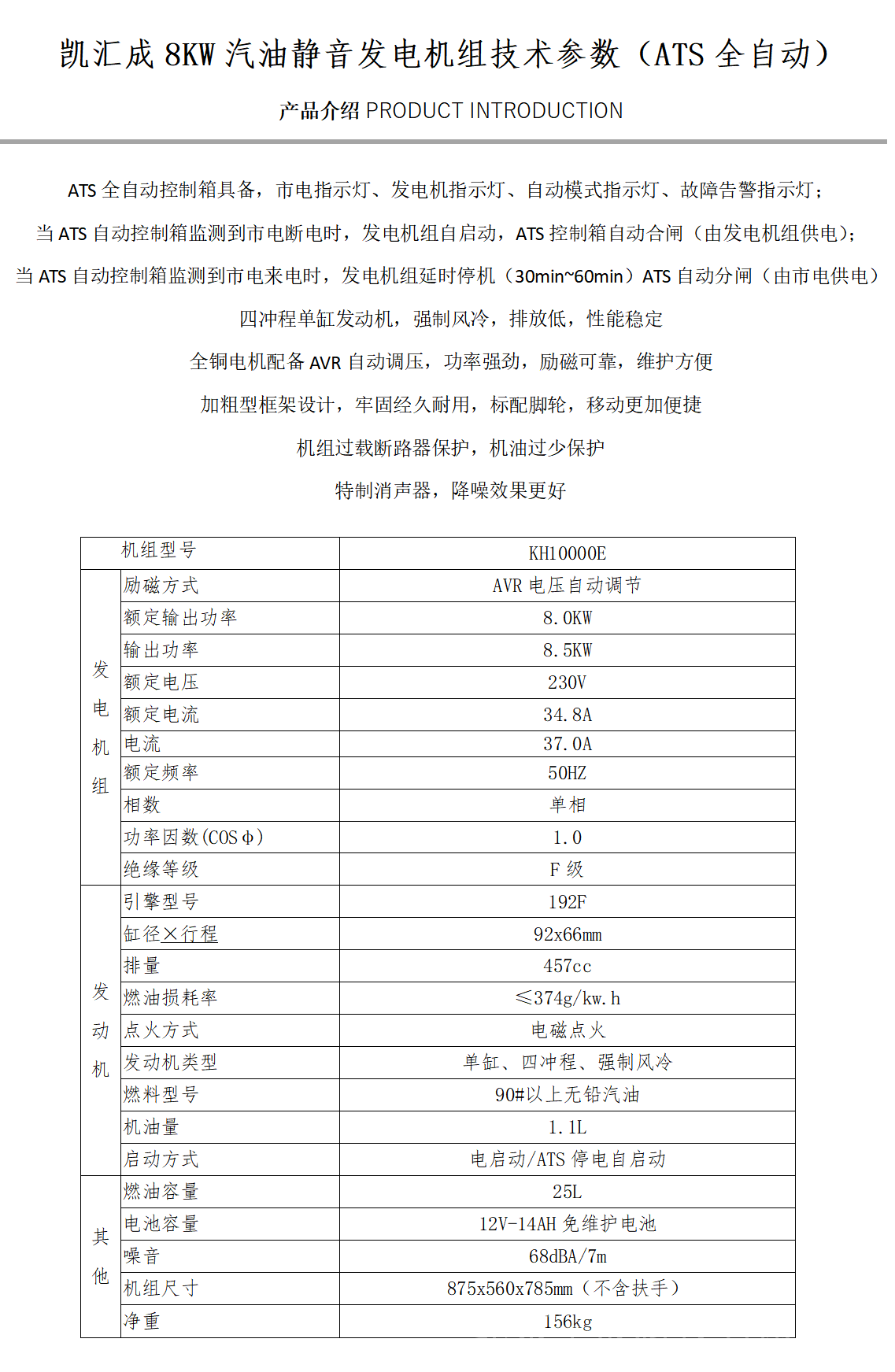 凯汇成品牌 静音便携式汽油发电机 8kw 静音系列 单三相 220vKH10000E