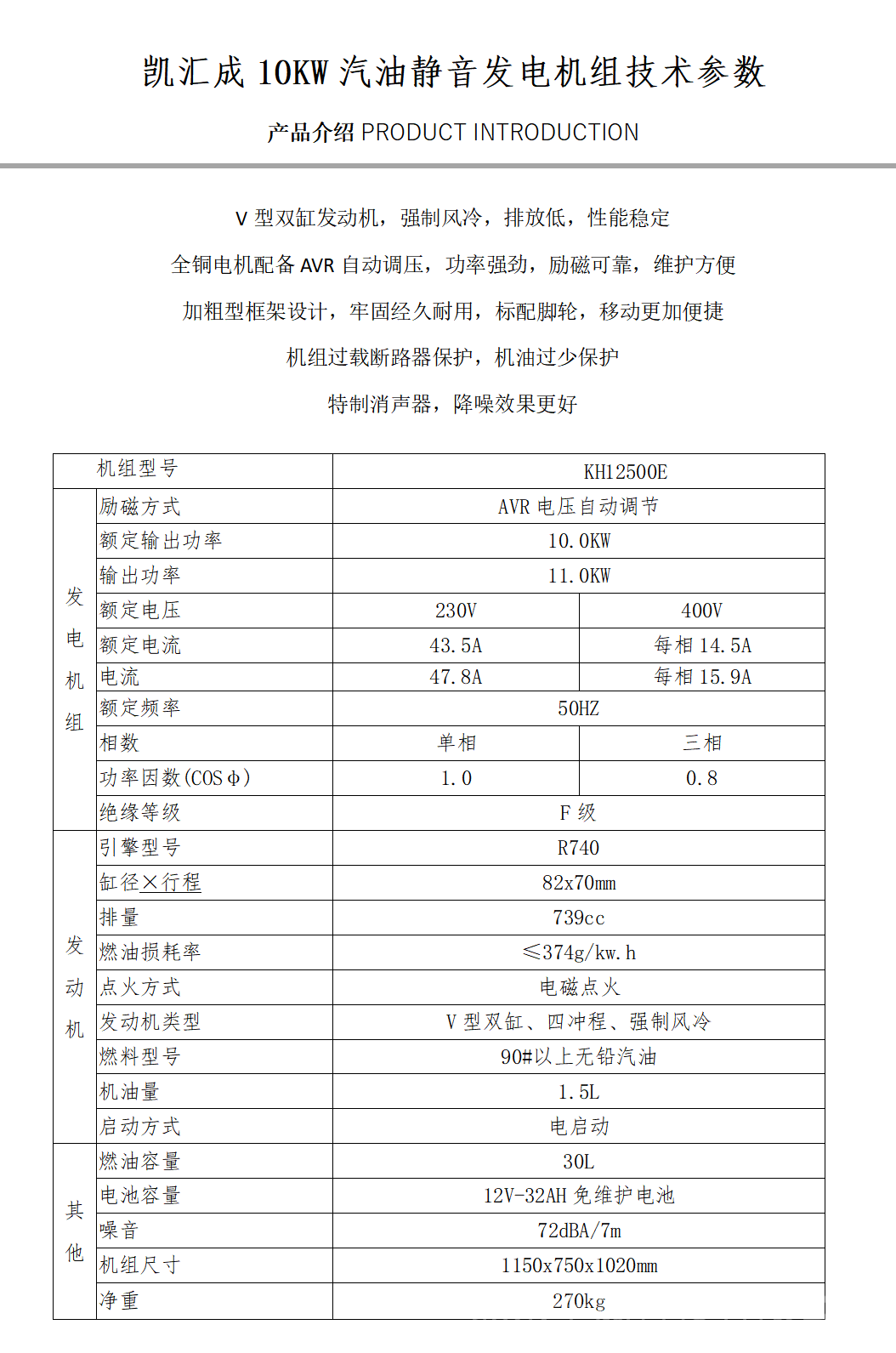 凯汇成品牌 静音便携式汽油发电机 10kw 静音系列 单三相KH12500E