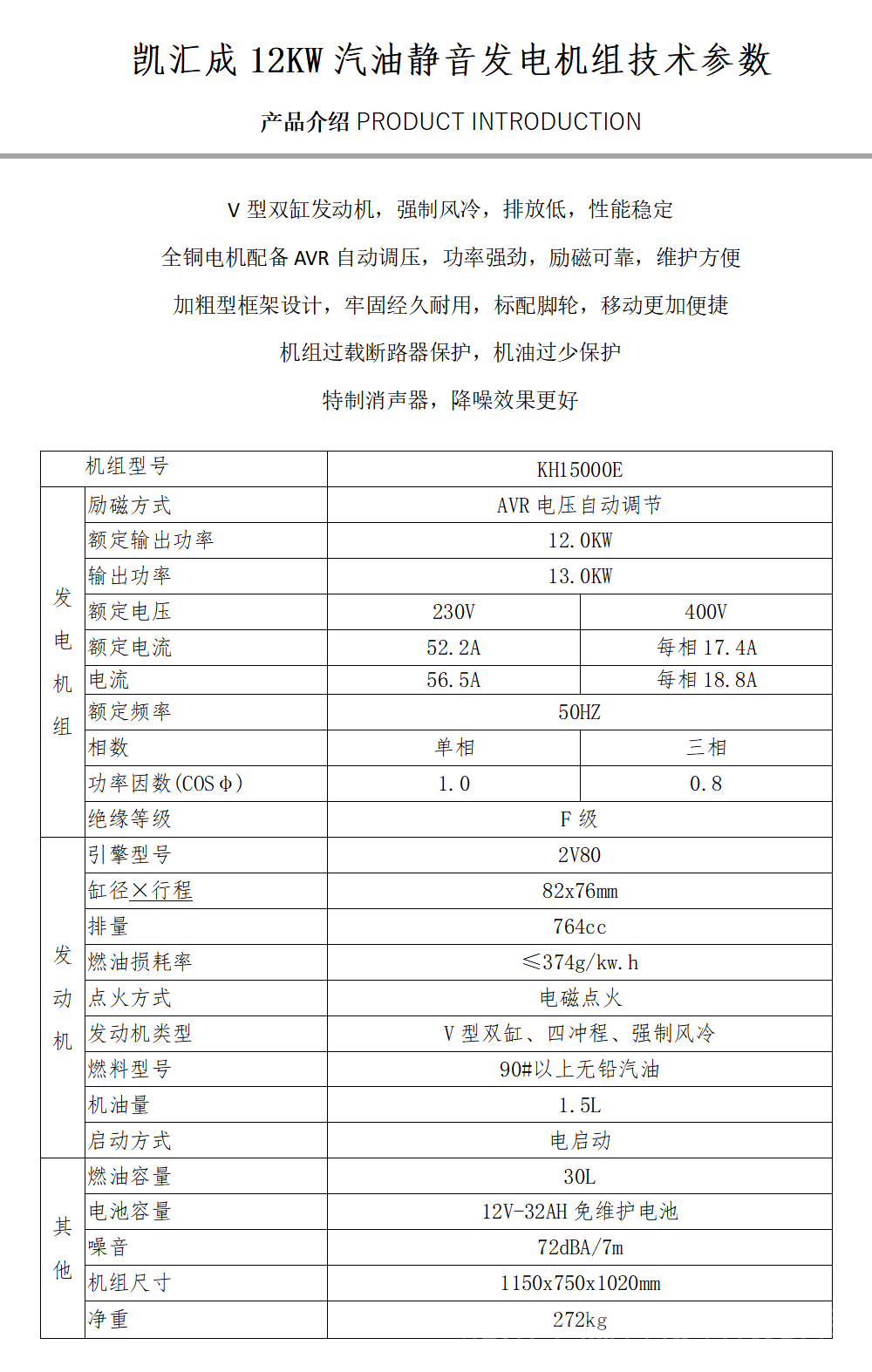 凯汇成品牌 静音便携式汽油发电机 12kw 静音系列 单三相KH15000E