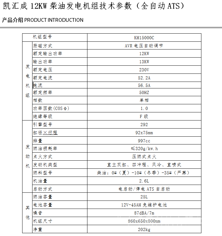 凯汇成品牌开架式便携式柴油发电机 12KW柴油等功率 单三相KH12500C