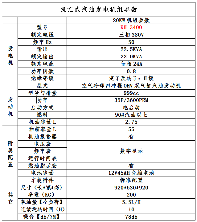 凯汇成牌开架式便携式汽油发电机 20kw 通用汽油发电机组KH-3400